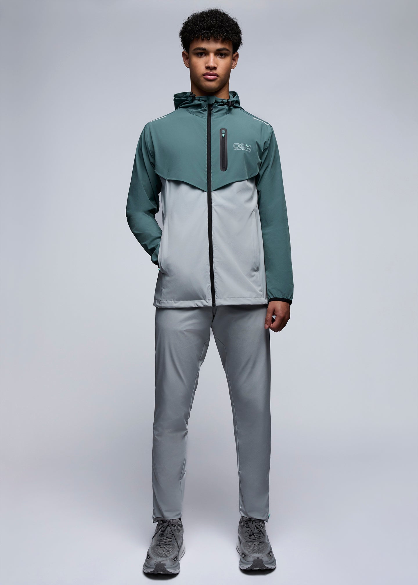 The Fell Track Top. Elevate your wardrobe with this versatile track top. Crafted from high quality polyamide, this tracksuit top features an adjustable bungee cord hood for a customised fit and secure zip pockets to hold your essentials. Complete with vented chest panel and the OEX reflective print branding. Matching track pant also available.